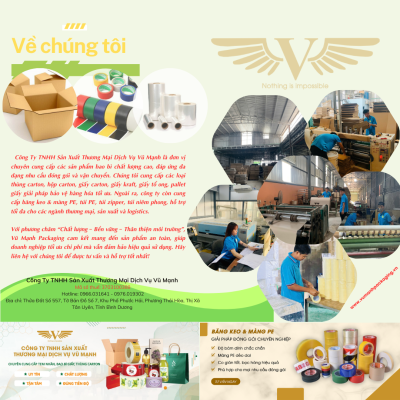 📍 Với xưởng sản xuất đặt tại KP Tân Phước Khánh, TP Tân Uyên, Vũ Mạnh là lựa chọn lý tưởng cho mọi cá nhân, đại lý, nhà máy đang cần vật tư đóng gói như băng keo, màng PE, thùng carton, túi nilon, OPP…